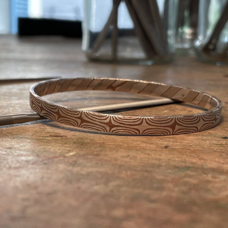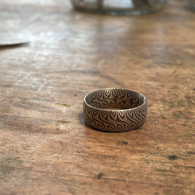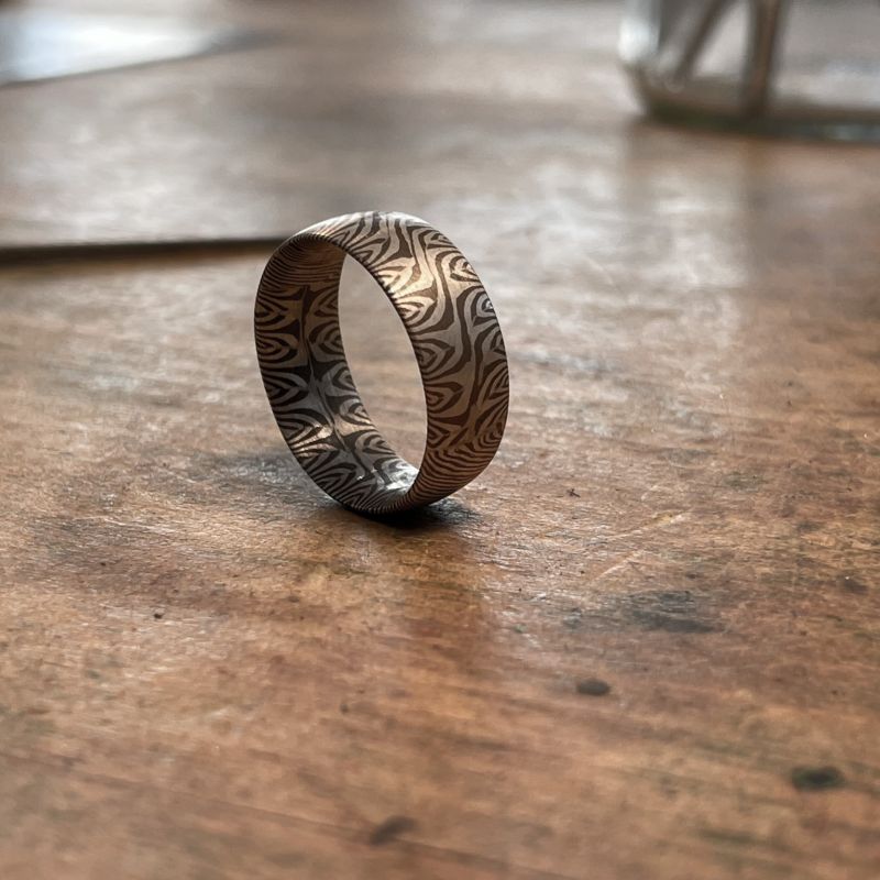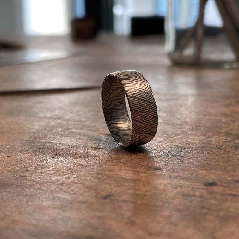 Mokume Gane ist eine alte japanische Technik, die in der Schmuckherstellung verwendet wird. Der Name bedeutet frei übersetzt "Holzmaserungsmetall" und beschreibt das einzigartige Aussehen. Die Technik wurde von japanischen Schwertschmieden entwickelt und war ursprünglich dazu gedacht, dekorative Griffe für Schwerter herzustellen.