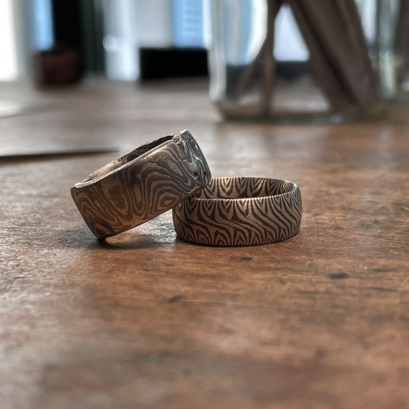 Mokume Gane ist nicht nur eine Technik, sondern auch ein Kunstwerk. Es erfordert Geschicklichkeit und Erfahrung, um die verschiedenen Metalle mit einander dauerhaft zu verbinden und diese in verschieden formen zu schmieden. Jedes Stück ist ein Unikat und zeigt die natürliche Schönheit der verschiedenen Metalle.